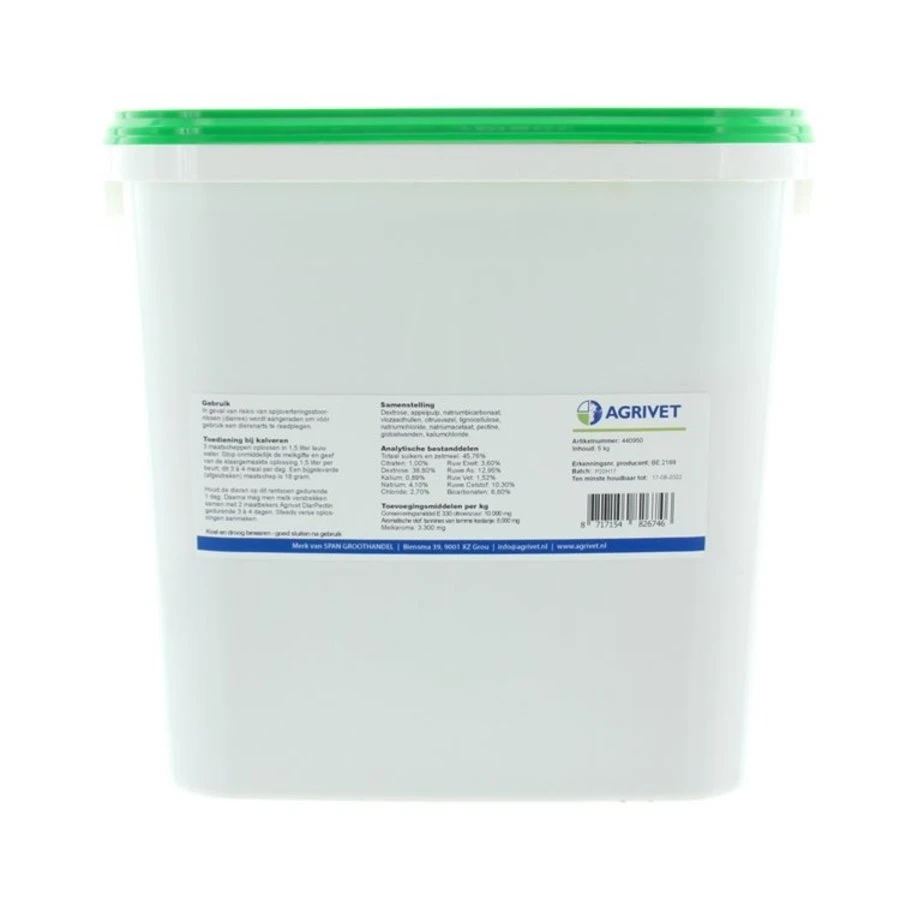 3 maatscheppen oplossen in 1,5 liter lauw water. Stop onmiddellijk de melkgifte en geef van de klaargemaakte oplossing 1,5 liter per beurt; dit 3 à 4 maal per dag. Een bijgeleverde (afgestreken) maatschep is 18 gram. Houd de dieren op dit rantsoen gedurende 1 dag. Daarna mag men melk verstrekken samen met 2 maatbekers Agrivet DiarPectin gedurende 3 à 4 dagen. Steeds verse oplossingen aanmaken.