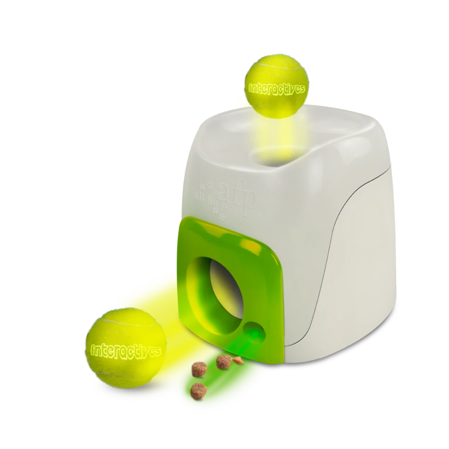 Dit leuke interactieve speeltje voorkomt eenzaamheid en verveling van uw hond. Door de tennisbal in de opening aan de bovenkant te gooien krijgt uw hond een beloning via het luikje dat automatisch open gaat. In deze machine bevind zich een aparte ruimte waar beloningen ingestopt kunnen worden. Train en speel met uw hond zodat die er zelf mee kan spelen. Voor uren speelplezier.