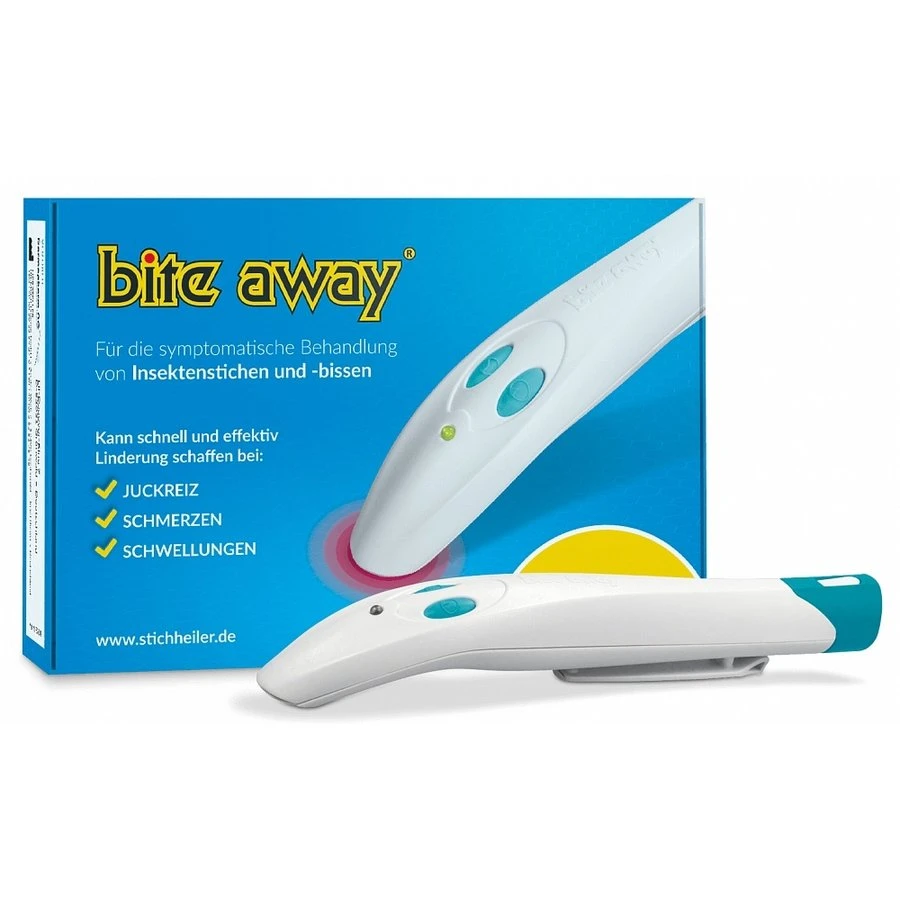 De Bite Away is het nieuwste middel om de jeuk en pijn te verlichten na een beet van onder andere een mug, bij of wesp. De Bite Away verwarmt de huid tot 50 graden om zo de het gif van de insecten af te breken. Het kan zelfs tot 2 dagen na de beet of steek nog worden toegepast.