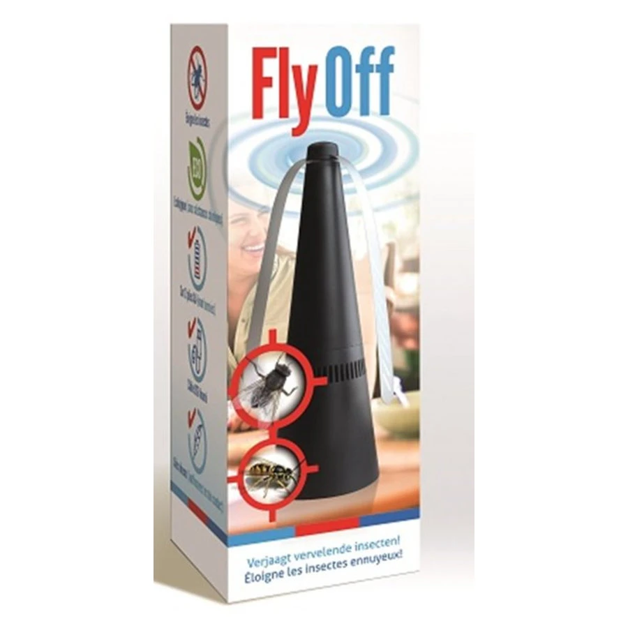 De Fly-Off Anti-insecten ventilator voorkomt dat er vervelende insecten bij u in de buurt komen. De ventilator verjaagt de insecten op een diervriendelijke manier. De ventilator werkt op 2 AA batterijen (niet meegeleverd en USB-kabel. De USB-kabel wordt meegeleverd. De vleugels van de ventilator zijn zacht en veilig om aan te raken.