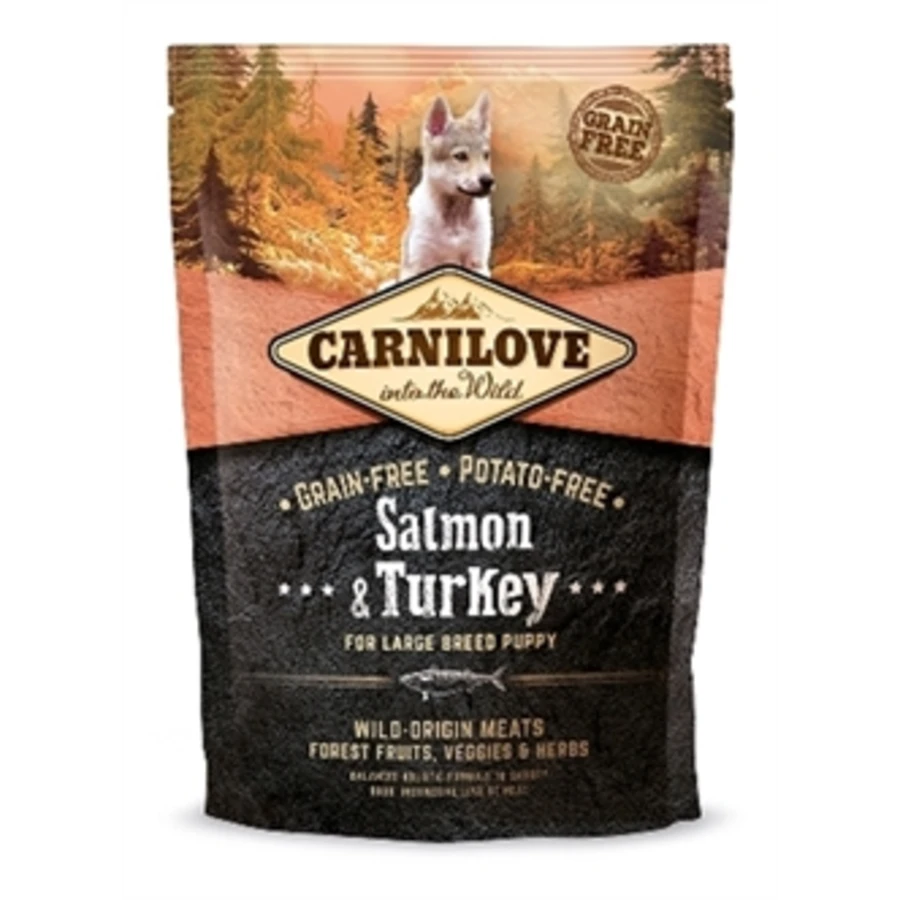 Carnilove Salmon / Turkey Puppies is graanvrij, kwalitatief hoogwaardig hondenvoer voor jonge honden van grote rassen met zalm en kalkoen, aansluitend bij de natuurlijke voedingsbehoefte van de hond. Deze puppybrokken zijn geheel vrij van aardappel en graan, omdat deze ook niet in het natuurlijke dieet van de wilde hond en wolf voorkomen. In plaats daarvan is er gebruik gemaakt van ingrediénten die beter aansluiten bij de voedingsbehoefte van de pup, namelijk een hoog aandeel dierlijke ingrediënten gecombineerd met verse groenten, fruit, kruiden en mineralen.
