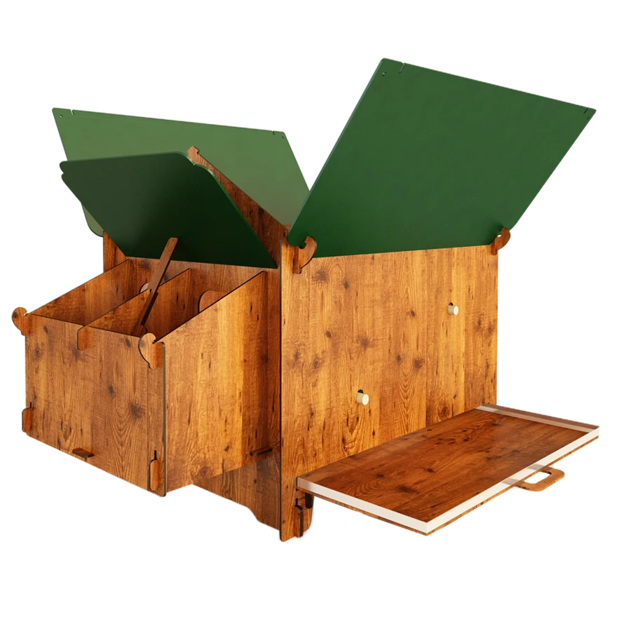 Het kippenhok kan gemakkelijk in en uit elkaar gehaald worden, dankzij de verbindingen in de platen. Daarnaast is het hok voorzien van een handige lade, zodat het hok gemakkelijk schoon te maken is. Dankzij de beweegbare dakplaten is eieren rapen een eitje en elk hok is voorzien van zitstokken en twee nestplaatsen buiten het hok.
