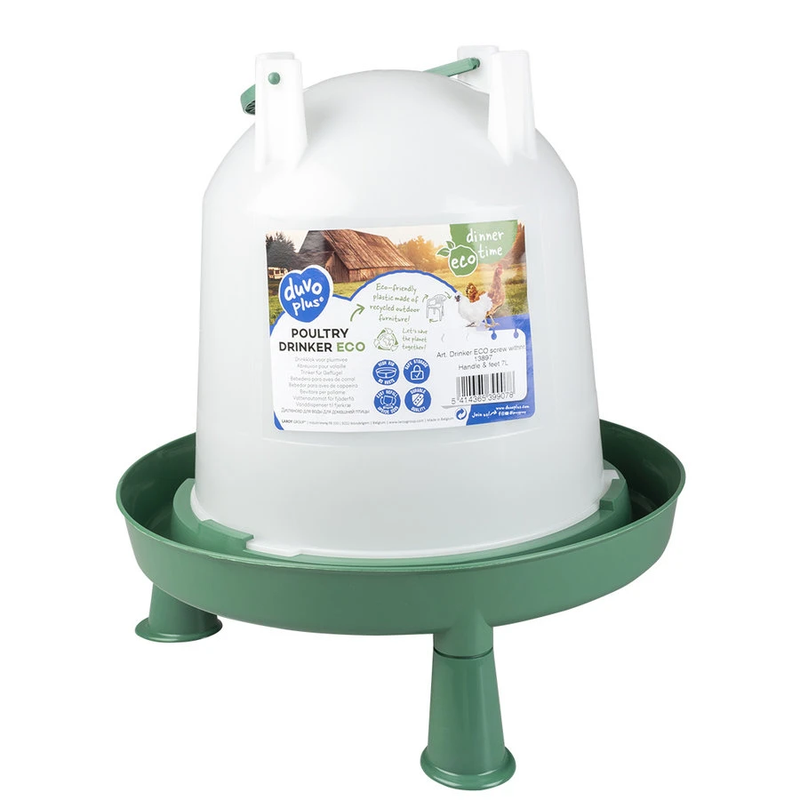 Deze ecologische groene drinkklok van duvoplus ECO is gemaakt van gerecycleerd tuinmeubilair. De robuuste en weerbestendige drinkklok is voorzien van een stevige en handinge bajonetsluiting waardoor deze makkelijk te vergrendelen is. Het sluitsyteem zorgt ervoor dat het bovendeel en de bodem goed aan elkaar vergrendeld zijn. Dankzij deze sluiting kan je de drinkklok makkelijk verplaatsen van plek in het kippenhok en hebben de kippen een langere tijd de beschikking over vers drinkwater. De drinksilo is ook voorzien van stevige en stabiele pootjes. Een must-have in elke kippenhok.