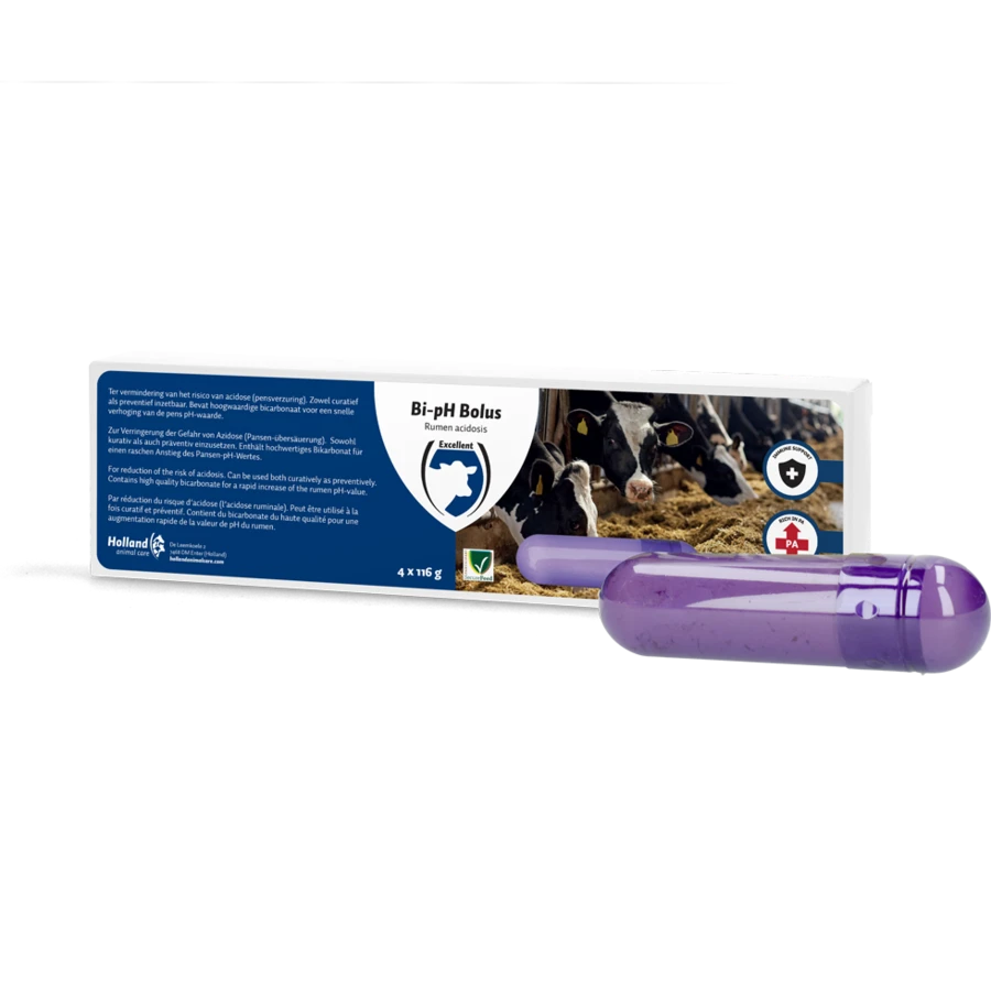 Dee Bi-pH bolus is speciaal voor hoogproductieve melkkoeien en bij verzuring (acidose) van de pensinhoud. Deze bolus bevat hoogwaardig bicarbonaat voor een snelle verhoging van de pens pH-waarde en is een aanvullend diervoeder voor melkvee. Het middel ideaal voor bij weinig herkauw-activiteit, hitte, transport. Het product is curatief en preventief inzetbaar