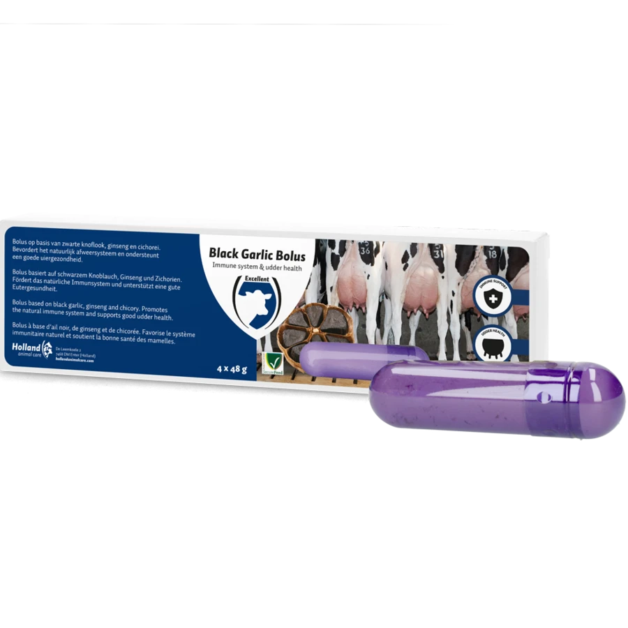 Deze aanvullende diervoeder voor melkvee bevat zwarte knoflook, cichorei en ginseng. De bolus die het natuurlijk afweersysteem bevordert en een goede uiergezondheid ondersteunt.
