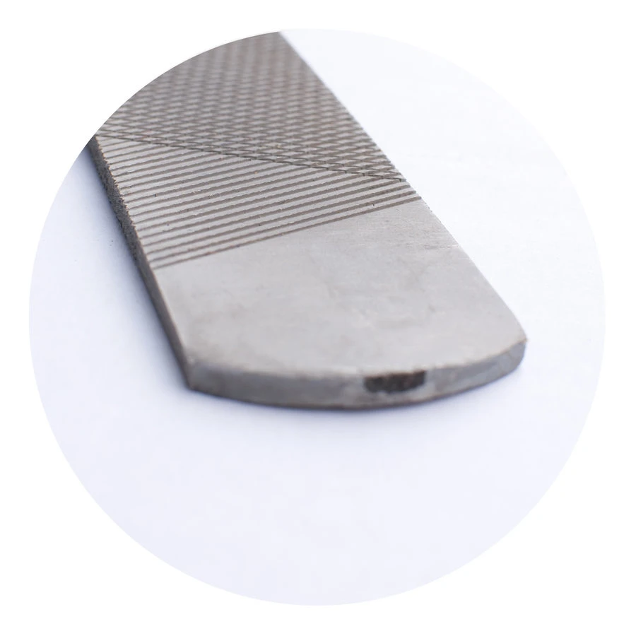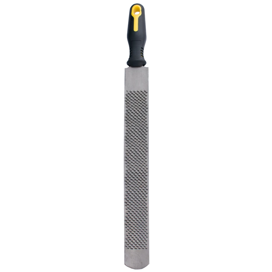 De hoefrasp met een handvat die aan de ene kant grof is en de andere kant fijn.