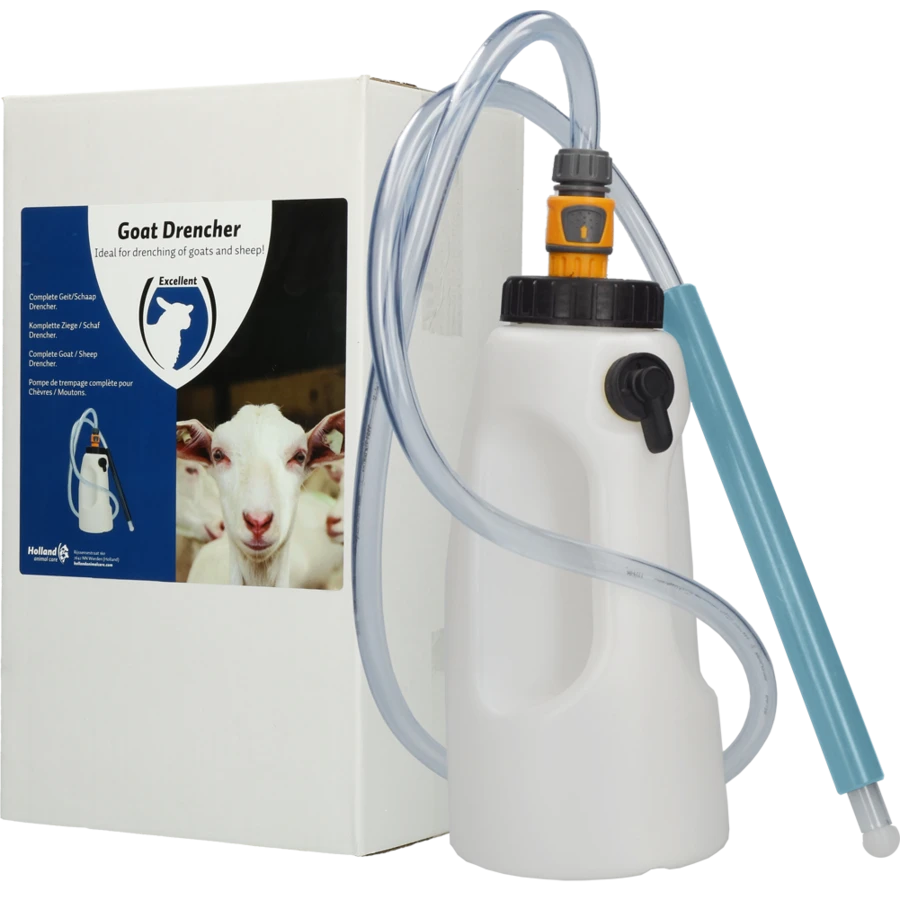 De complete drencher set voor het eenvoudig toedienen van drench producten bij geiten en schapen. Deze drencher geef een ergonomische handgreep en grote schroefdop. Dankzij de brede flesopening is deze makkelijk te vullen en reinigen. Met de grote bodem, staat de Goat Drencher zeer stabiel.