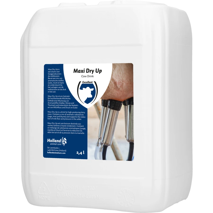 Maxi dry up is de drank voor hoogproducerende melkkoeien die ondersteuning nodig hebben bij het verlagen van de melkstroom en de druk in het uier. Bevat een mix van aromatische stoffen (salie, munt en tijm).