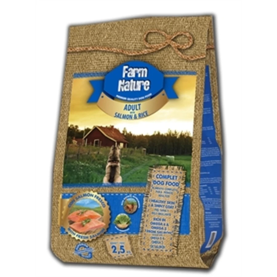 De omega-3 en omega-6 vetzuren zijn afkomstig uit hoge kwaliteitsproducten (kip en zalm). Deze voedingsstoffen zorgen voor een optimale conditie van de huid en vacht van uw hond. Farm nature salmon/rice is volledige diervoeding voor honden.