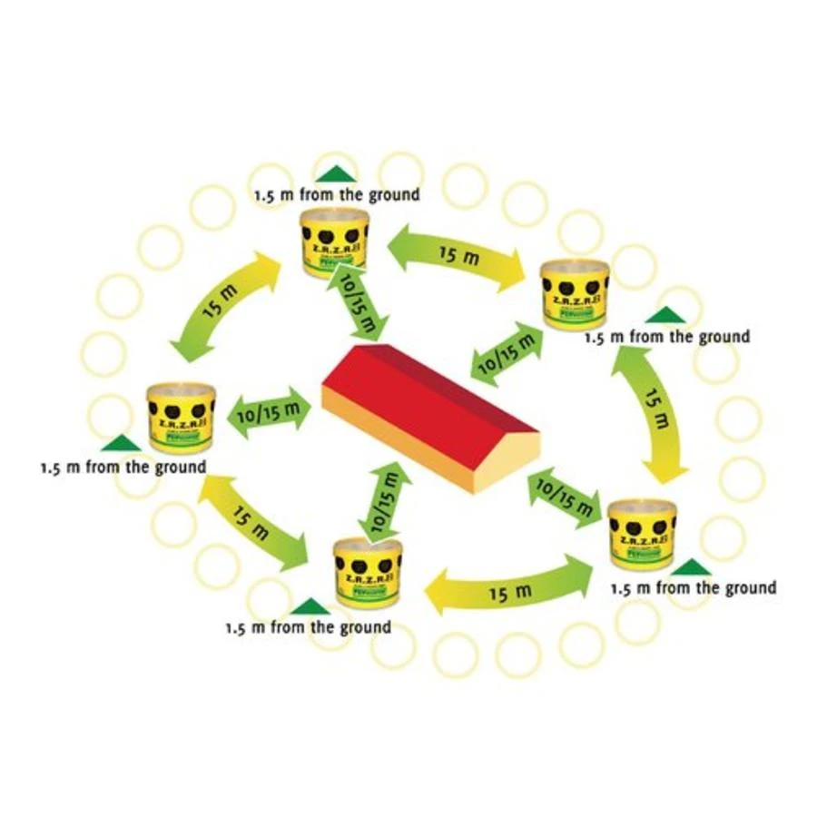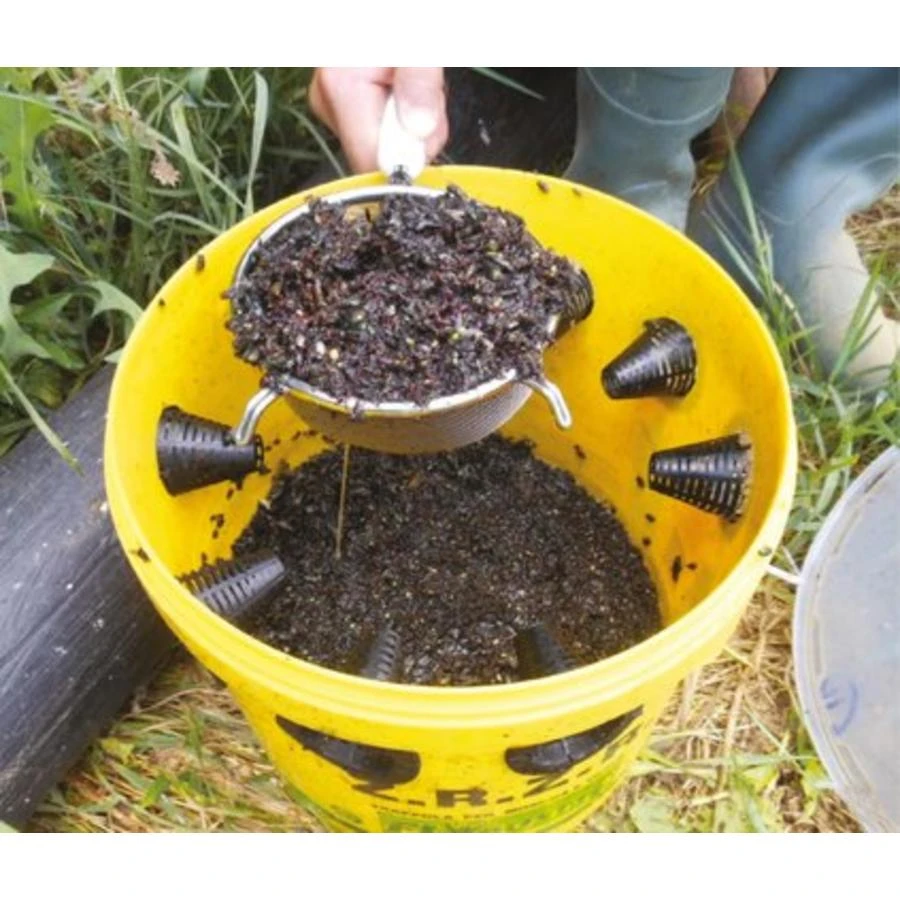 Klik de kegels in de gaten van de emmer en vul de emmer met lokstof naar keuze. Plaats de vliegenval op 1,5 meter hoogte op ongeveer 10 tot 15 meter van het huis of de stal.