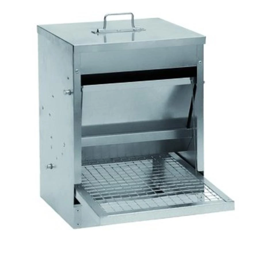 Gegalvaniseerde voerstation voor kippen. Het voerstation gaat open als de kip op het deurtje gaat staan. Zodra deze klaar is met eten gaat het deurtje weer dicht. Dit voorkomt onnodige verspilling van eten en voorkomt tevens dat muizen en ander ongedierte bij het eten kunnen komen.