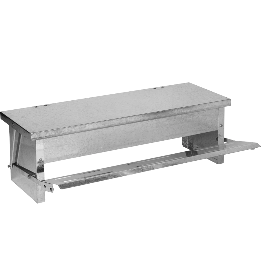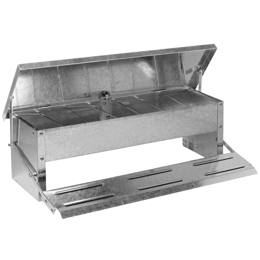 De Gaun Voerbak met trapsysteem is een handig voersysteem voor uw kippen. Pas als een kip op de traptrede staat, gaat het deksel open en kan de kip bij het voer komen. Zo blijft het voer buiten bereik van ongedierte en blijft het ook droog en vrij van vuil.