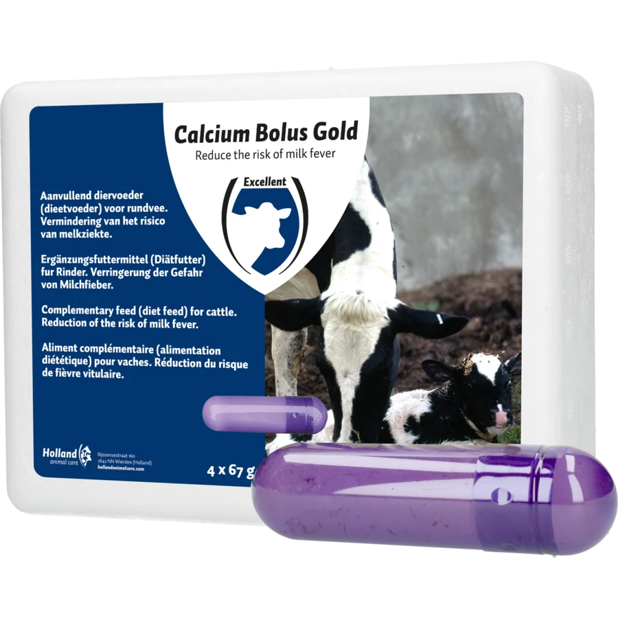 Calcium Bolus Gold is voor de melkkoeien om deze extra calcium te geven. Melkkoeien neigen melkziekte te krijgen door een acuut tekort aan calcium in het bloed. Deze bolus is eenvoudig toe te dienen en word snel opgenomen in de pensvloeistof. Daarnaast is er geen irritatie van slokdarm en voormagen. Ook is er geen risico op verslikken en/of longbeschadiging.