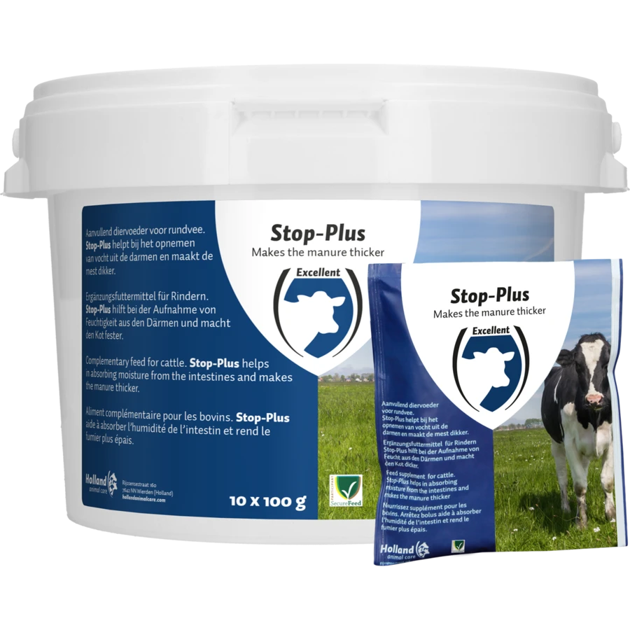 Stop plus is het middel voor rundvee die helpt bij het opnemen van vocht uit de darmen en daarmee de mest dikker maakt. Het product is goed tegen ingewandsstoornissen en wordt als aanvulling op het normale rantsoen gegeven. Het is een een middel dat inzetbaar is bij runderen waarbij de darmen ‘van streek’ zijn.