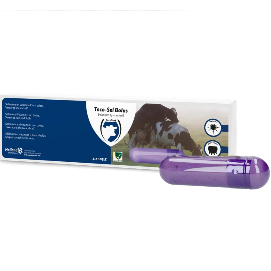 De Toco-sel bolus bevat een combinatie van vitamine E en selenium voor jongvee en volwassen rundvee. Dit is een direct werkende bolus die essentieel is voor verkrijgen optimale vruchtbaarheid, groei, ontwikkeling en immuunsysteem. Belangrijk rond het afkalven, zowel voor de koe als ook voor de pasgeboren dieren.