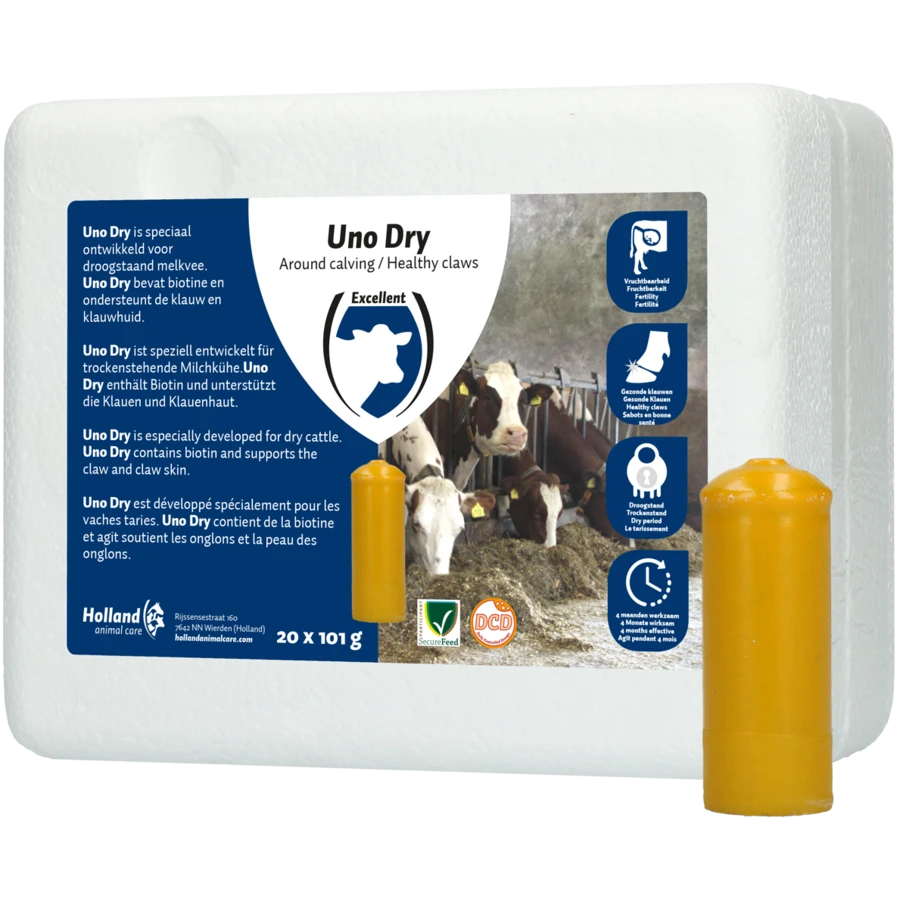 Uno dry is de mineralen bolus met als toevoeging Biotine voor mineralentekorten en hardere klauwen van uw vee. Dit product is speciaal ontwikkeld voor droogstaand vee en word ook wel de droogstandbolus genoemd. Dit is een unieke bolus vanwege de ondersteuning van klauw en klauwhuid. Voorziet uw vee in 1 behandeling van 6 belangrijke mineralen en 4 essentiële vitaminen. Het product is 4 maanden werkzaam en arbeidsbesparend.