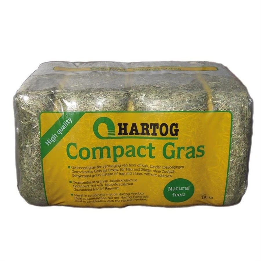 Compact Gras van Hartog wordt gemaakt van een speciaal grasmengsel met een constante kwaliteit. Het product wordt op hoge temperatuur gedroogd, hierdoor blijven de voedingsstoffen, vitaminen en mineralen beter behouden. Compast Gras is gegarandeerd vrij van onkruiden en schadelijke stoffen en is stof arm en schimmelvrij.