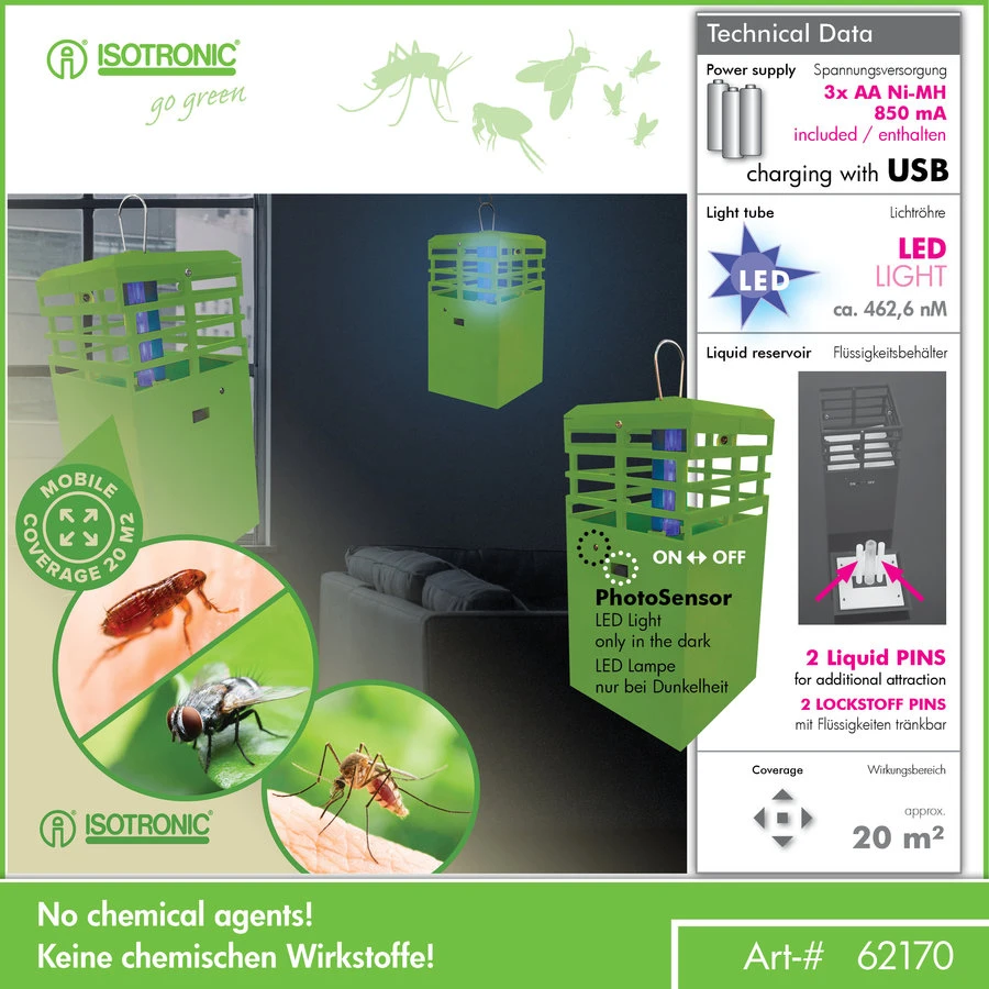 Deze insectenval werkt zonder chemicaliën en veroorzaakt geen vervuiling. Vervelende insecten o.a. Muggen en fruitvliegen worden aangetrokken door een speciaal blauw en bewezen licht. Op weg naar de lichtbron blijven ze plakken op de in het apparaat geïntegreerde plakfolie.