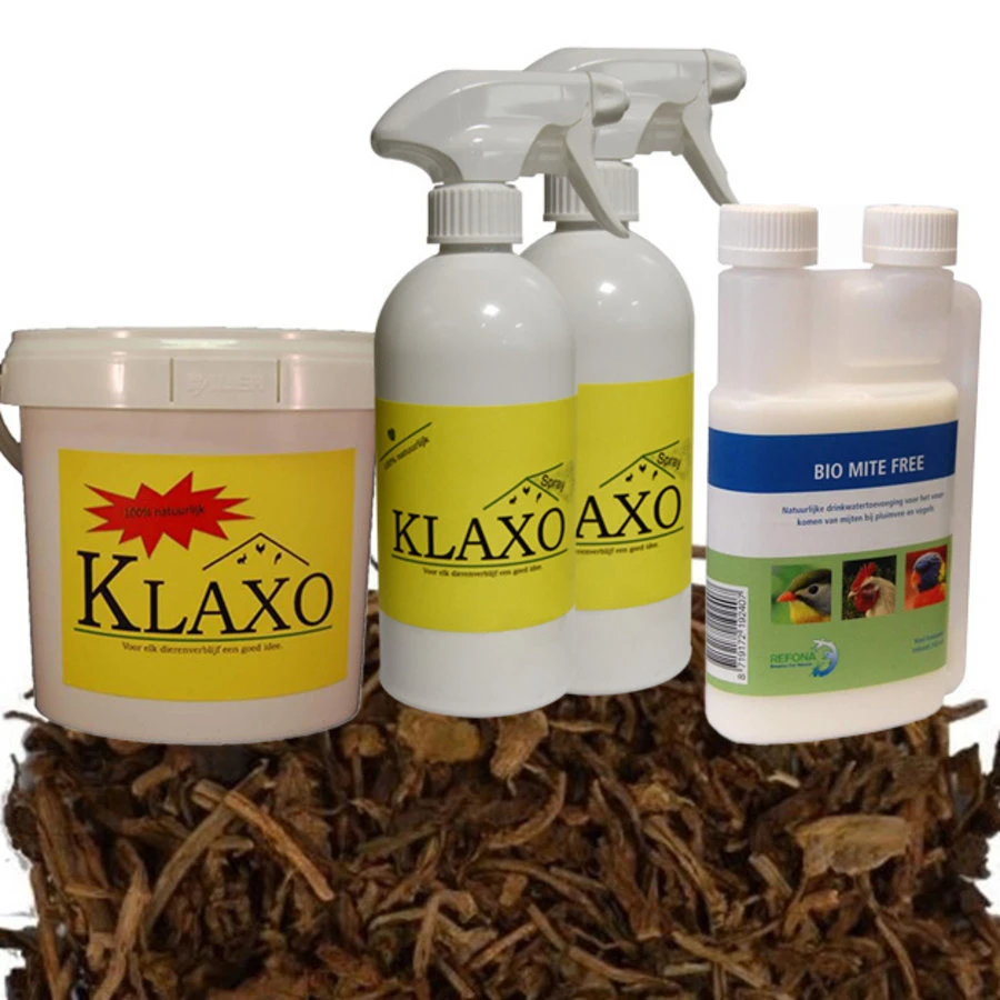 De witkalk zorgt er voor dat de aanwezige roofmijten zullen sterven en de nestmogelijkheid beperkt wordt door het vullen van naden kieren. De Klaxo spray is er voor om snel en gemakkelijk de witkalk laag bij te houden. De tabaksnippers houden uw legnesten vrijer van bloedluis dan enige andere bodembedekking en de watertoevoegig zorgt voor een bestrijding van binnen uit de kip. Zonder veel extra werk houdt u uw kippen dus vrij van bloedluis en zorgt voor een goede start in het voorjaar, u bent de bloedluis dit jaar een stap voor!