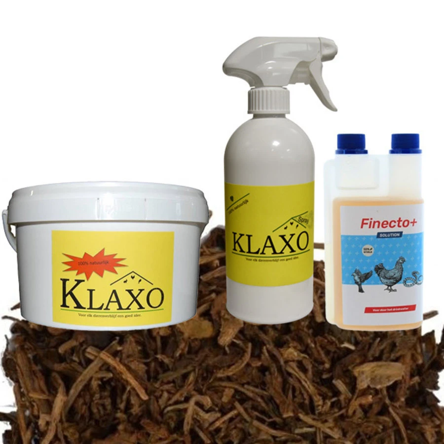 De witkalk zorgt er voor dat de aanwezige roofmijten zullen sterven en de nestmogelijkheid beperkt wordt door het vullen van naden kieren. De Klaxo spray is er voor om snel en gemakkelijk de witkalk laag bij te houden. De tabaksnippers houden uw legnesten vrijer van bloedluis dan enige andere bodembedekking en de watertoevoegig zorgt voor een bestrijding van binnen uit de kip. Zonder veel extra werk houdt u uw kippen dus vrij van bloedluis en zorgt voor een goede start in het voorjaar, u bent de bloedluis dit jaar een stap voor!