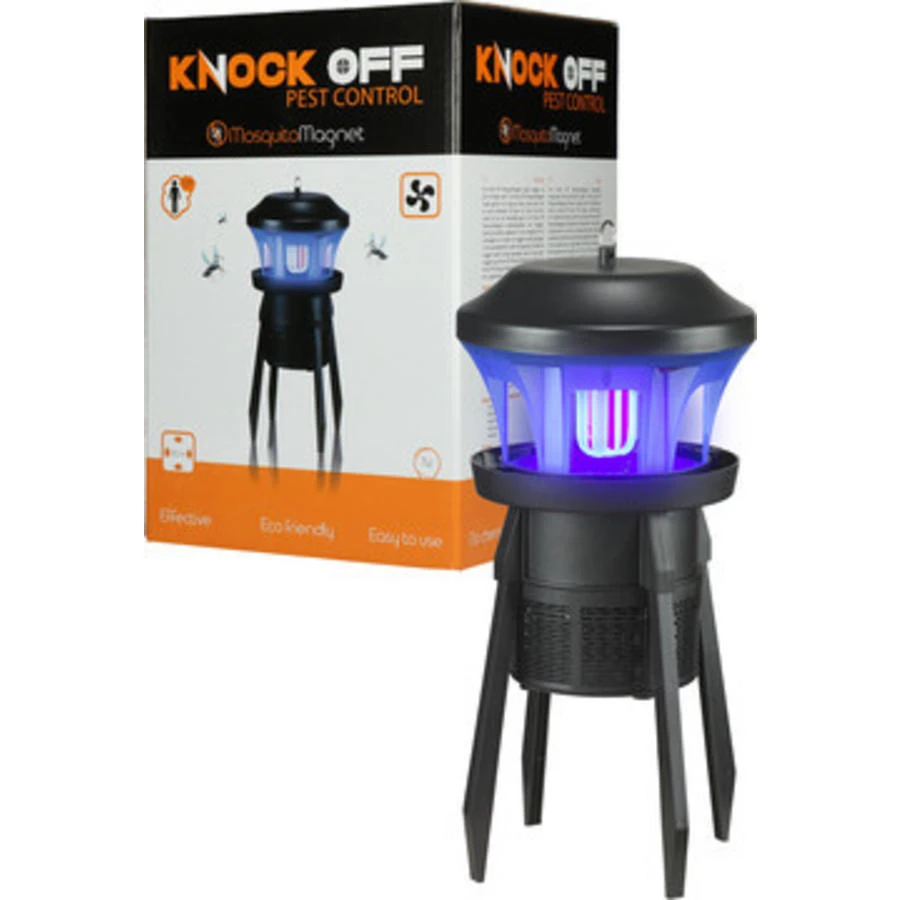 Deze elektrische insectenvanger vangt muggen uit alle richtingen (360°). De Knock Off Mosquito Magnet maakt gebruik van speciaal blauw ultra-violet licht en stoot menselijke CO2 geur uit. Door het ultra-violet licht en de menselijke geur is de Knock Off Mosquito Magnet onweerstaanbaar voor muggen. Dankzij de sterke zuigkracht is het onmogelijk om te ontsnappen en worden de muggen levend gevangen in het opvangreservoir onder het apparaat. Doordat de muggen levend worden gevangen zullen er nog meer muggen op de Knock Off Mosquito Magnet af komen. De Knock Off Mosquito Magnet is zuinig in gebruik en heeft een vangstbereik van 100 m2.