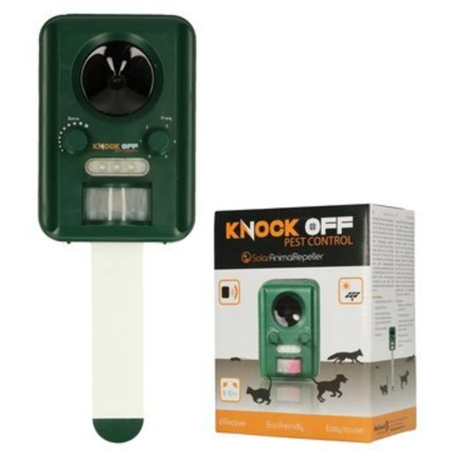 De Knock Off Solar Animal Repeller verjaagt meerdere ongewenste diersoorten uit uw tuin, vijver of erf. Het ultrasone signaal is zeer sterk en komt alleen in werking als er dieren (bijv. honden, vossen, katten, vogels, marters etc.) in de buurt komen. De Knock Off Solar Animal Repeller beschikt over een bewegingsmelder en flitslicht en kan op verschillende manieren ingesteld worden. De Knock Off Solar Animal Repeller werkt op zonne-energie. Werkt tot ca. 8-10 m afstand.