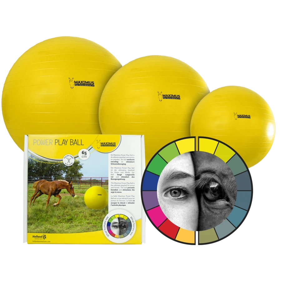 Deze Maximus Power Play Ball voorkomt verveling en stimuleert lichaamsbeweging bij uw paard en pony. Paarden zien kleuren zeker maar hun kleurzicht is vergelijkbaar met een kleurenblind persoon: zij zien blauw, geel, wit en grauw, maar kunnen groen en rood slecht van elkaar onderscheiden.