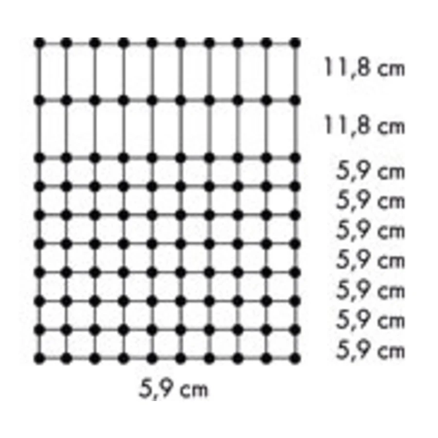 Het net heeft grote mazen aan de bovenkant en kleine mazen aan de onderkant. Bovenin hebben ze een maaswijdte van 11,8 cm en onderin 5,9 cm. Dit maakt het net uitermate geschikt om zowel kleine dieren, zoals konijnen, maar ook grotere dieren zoals wilde zwijnen en dassen tegen te houden. Het net kan volledig onder spanning worden gezet met een stroomklok.