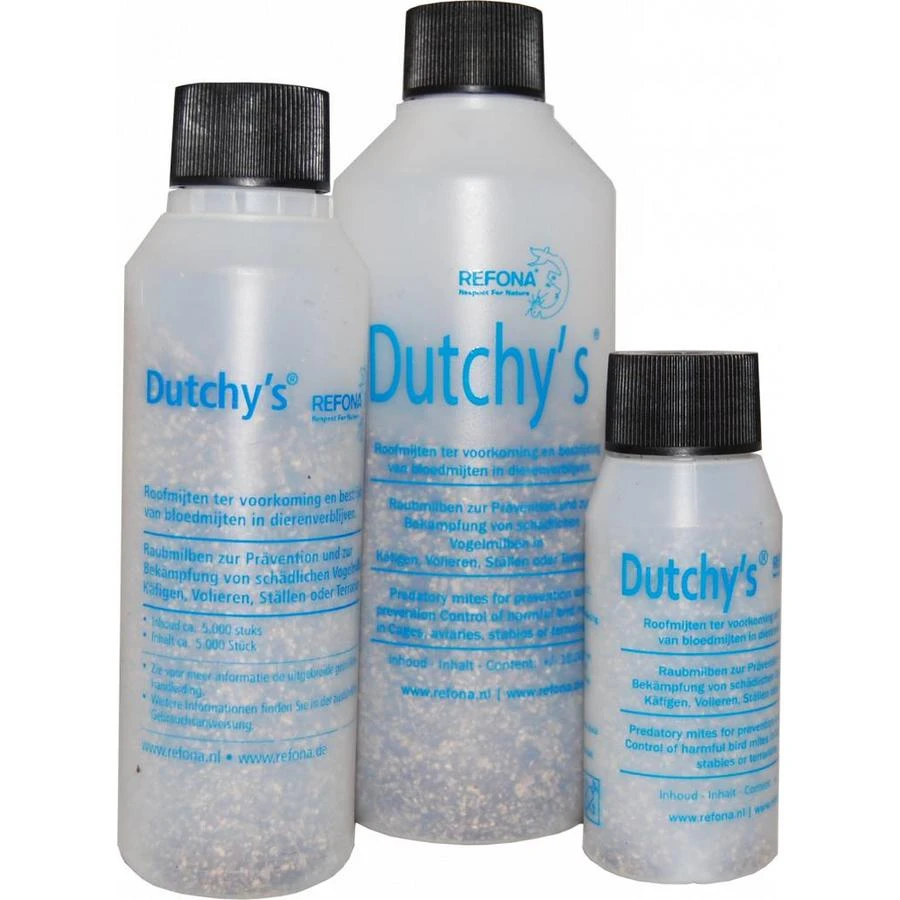 2.500 Dutchy’s: bevat ca. 10 doseringen, genoeg om ongeveer 10 m² voorbehoedend Dutchy’s® in te zetten of ca. 5 m² van een besmet dierenverblijf ontdoen van bloedmijten.