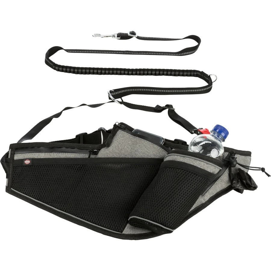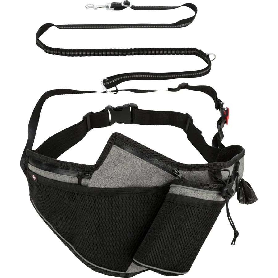 Joggingceintuur met riem ideaal voor canicross of om mee te joggen/wandelen met uw hond. Deze riem heeft een aanlijn-systeem: verdeelt de impact van het trekken van de hond gelijkmatig over de taille van de loper. Plotseling trekken van de hond wordt door schokdemper opgevangen. Met aangenaam draagcomfort door ergonomisch ontwerp en zacht inzetstuk van mesh. De riem heeft een traploos verstelbare riem met handlus, waardoor ook voor het normale meevoeren geschikt. Daarnaast heeft het joggingceintuur diverse vakken en een bekerhouder. Het is gemaakt met een singelband en waterdichte ritssluitingen. Poepzakjes kunnen eenvoudig worden meegenomen dankzij de geïntegreerde poepzakjes-dispenser. En uw hond zal ook in het donker te zien zijn dankzij de reflecterende elementen.