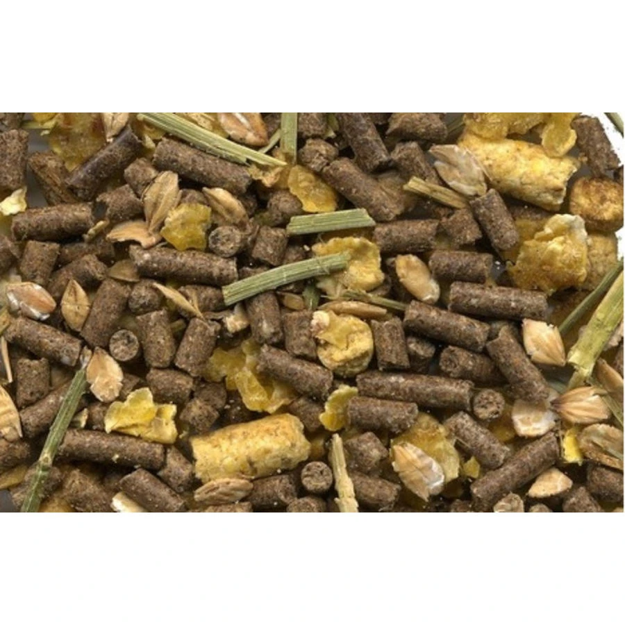 Gerstevlokken, kortmeelpellets, vlaskafkorrel, maisvlokken, luzerne, gerst, luzerne lange vezel, palmpitschilfers, sojahullen, maisgluten, melasse, spelt, moutkiemen, covaminosoy, grasmeel, koekmeel, tarwe, krijt, citruspulp, kalksteentjes.