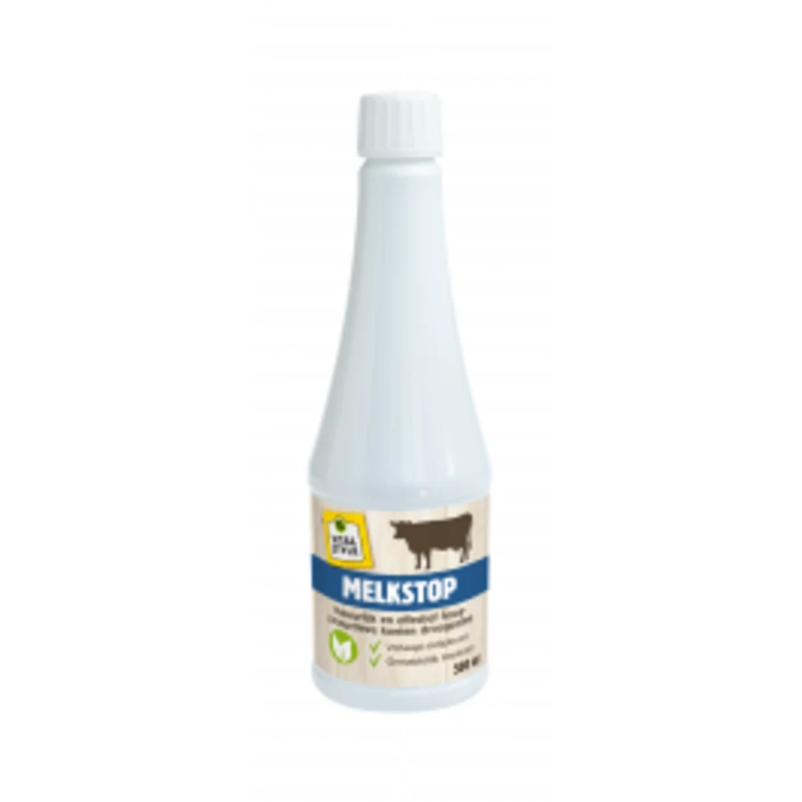 Melkstop 500 ml bevat een mengsel van natuurlijke aromatische stoffen uit kruiden die de melkdrang beïnvloeden. De melkstroom wordt verlaagt en de druk in de uier neemt af. Melkstop is een aanvullend diervoeder voor hoogproductieve melkkoeien.
